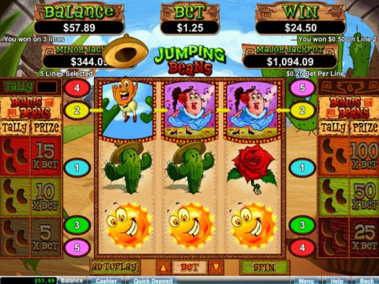 Casino de jogos em tempo real está aqui novamente com outro fantástico jogo de slot de vídeo intitulado "Jumping Beans". Este título de jogo foi lançado em julho de 2013. Este jogo tem três rolos, 5 linhas de pagamento com um tema de festa feito com base no feijão maluco.