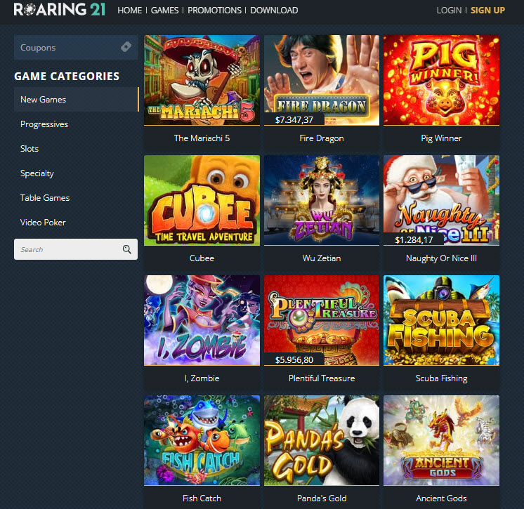 O Roaring 21 oferece mais de 125 jogos de título de slot, 15 jogos de mesa, 14 jogos de videogame, 6 progressistas, blackjack, bacará, roleta, 2 jogos especializados e 3 jogos de mesa especializados. De particular interesse está rugindo jogos progressivos do 21, que oferecem aos jogadores 7 dígitos POTS.
