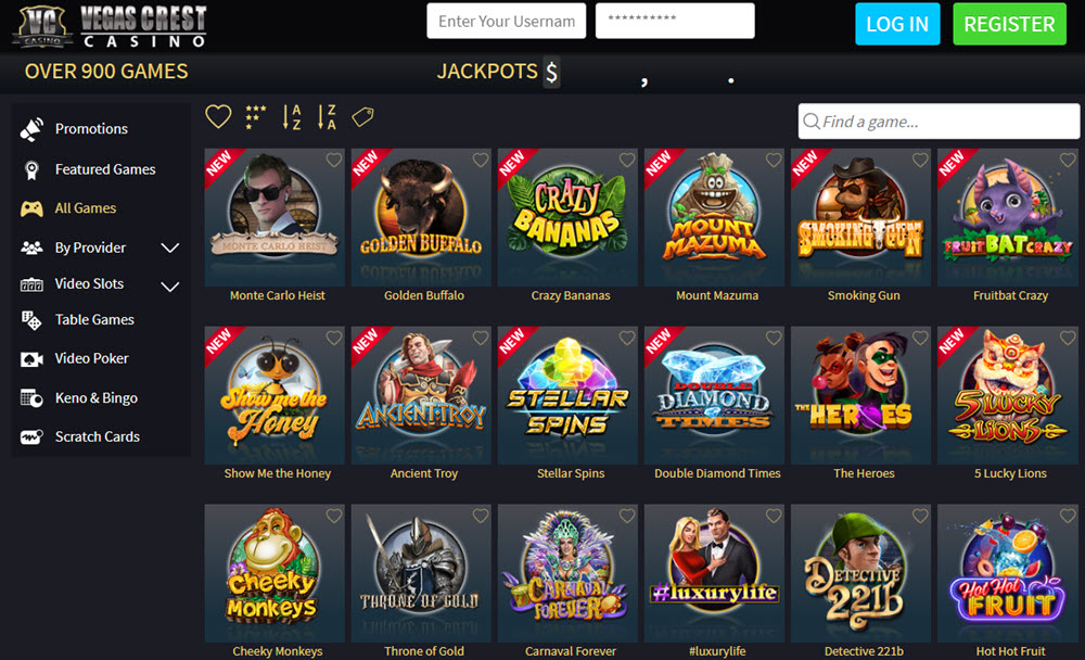 Na Crest de Vegas, você tem acesso a mais de 360 jogos cuidadosamente selecionados que atendem a uma gama diversificada de gostos e preferências. Sempre há algo para todos, apesar das variadas preferências pessoais. O Casino faz parceria com os melhores provedores de software do mundo, incluindo Betsoft, Vista Gaming, Rival e Saucify, para que o resultado final de sua criação não seja nada menos que a perfeição. Existem novos jogos que continuam surgindo mensalmente, o que oferece algo para esperar e se empolgar.